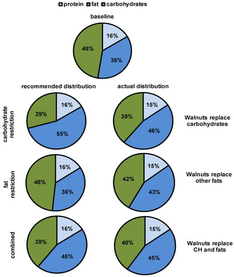 Against this background, the question arises whether it is of any relevance which kind of macronutrient is substituted by the walnuts. Subjects will reduce carbohydrates, fat, or both when they consume walnuts, which may influence the lipid modifying effect. Furthermore, we wanted to investigate whether the time point of consumption (meal or snack) has an effect on the lipid profile, as it has been shown for almonds (which have a more pronounced effect when taken as a snack) [].