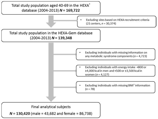 Updated from the previously published HEXA studies, the current study uses the HEXA-G (Health Examinees-Gem) participant sample which was given additional eligibility criteria on the participating sites (i.e., health examination centers and training hospitals). Of the original 38 sites, HEXA-G applied exclusion criteria of the following: 8 sites (n = 9370) that only participated in the pilot study years 2004–2006; 8 sites (n = 12,205) that did not meet the HEXA biospecimen quality control criteria (i.e., different testing protocols); and 5 sites (n = 8799) that have participated in the study for less than two years. In the new HEXA-G data, a total of 139,348 participants remained. Among in HEXA-G subjects, a total of 7274 were excluded: missing information on any MetS components at baseline survey (n = 4723); energy intake <800 or ≥4000 kcal/day in men and <500 or ≥3500 kcal/day in women (n = 4127); and missing information on Body Mass Index (BMI) (n = 78). Ultimately, 130,420 subjects, including 43,682 men and 86,738 women, remained in the final analysis (Figure 1). All of the participants voluntarily signed an informed consent form. This study was approved by the Ethics Committee of the Korean Health and Genomic Study of the Korean National Institute of Health, and the institutional review boards of all participating hospitals (IRB No. E-1503-103-657).