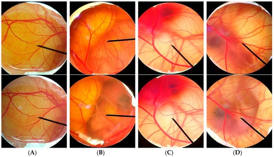 Photographs illustrating the effect of: (A) negative control (0.9% (w/v) NaCl); (B) positive control (1% (w/v) SLS); (C) vehicle (jojoba oil); and (D) EA (0.5% (w/v) solution in jojoba oil) in hen's egg test chorioallantoic membrane (HET-CAM) assay before applying the sample (upper) and at the end of the experiments of 60 min (lower)