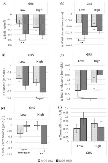 Interestingly, concentrations of total circulating carotenoids showed significant differences depending on MDS level only for those volunteers with a high GRS. Those individuals with a high MDS exhibited a greater reduction than those with a low MDS in carotenoids during the follow-up period (Figure 2e: −0.006 μmol/L vs. −0.163 μmol/L, p = 0.007). No significant differences were detected for the Omega3 index (Figure 2f).