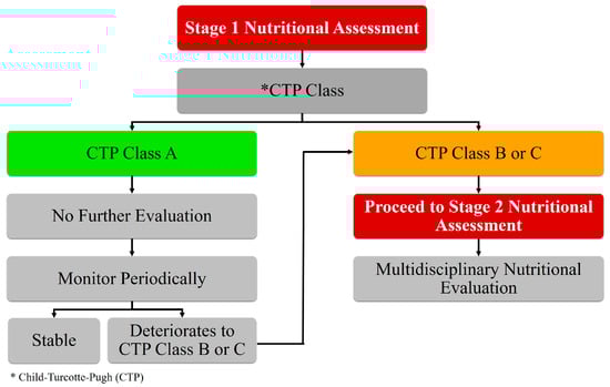 The goal of a two-stage approach is to maximize the allocation of time and resources to those who need it the most to improve overall outcomes. Not every patient needs an immediate full evaluation (stage 2 assessment) for malnutrition; patients who are the most at risk should be targeted first and assessed. Malnutrition severity is strongly associated with the severity of hepatic decompensation (liver failure) in the setting of cirrhosis [3,13]. A Chinese study evaluating malnutrition in patients with chronic liver disease found that patients with the highest rate of nutritional risk were also those with the greatest degree of liver failure (patients in Child-Turcotte-Pugh (CTP) classes B and C) [13]. The two-stage approach uses the association between malnutrition and severity of liver failure to identify the patient population in immediate need of nutritional assessment using the CTP scoring system. This classification, created by Child and Turcotte in 1964 and later adjusted in 1973 by Pugh, is a commonly-used tool for measuring the severity of liver failure in cirrhotic patients and to estimate the risk of surgical procedures [14,15,16]. The CTP system scores 1–3 points, with one being the most normal and three being the most abnormal, in five different categories (albumin, bilirubin, prothrombin prolongation time, and hepatic encephalopathy) to grade patients into three classes: A (5–6 points), B (7–9 points), and C (10–15 points), with classes B and C being the most severe [17]. This constitutes the ‘stage 1 assessment’ and identifies patients with cirrhosis at the highest risk of malnutrition, namely CTP classes B and C [13]. Another study evaluated of cirrhotic patients for malnutrition categorized by the three CTP classes and noted malnourishment in more than half the patients in the CTP class B and C groups, 77.3% and 94.4% respectively, while less than half of the patients in CTP class A developed malnutrition [3]. In a study that compared the Subjective Global Assessment (SGA) of patients’ nutrition with their CPT class, only patients in class B and C were indicated to have levels of malnutrition ranging from moderate to severe [11]. Thus, cirrhotic patients with CTP class B and C have been shown to be the most likely to develop malnutrition and require comprehensive ‘stage 2 assessment’ for poor nutritional status.