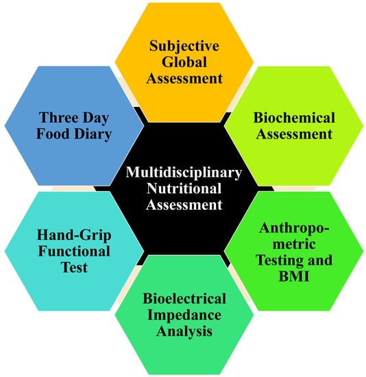 A more thorough and comprehensive evaluation of the nutritional status can be achieved and a focused individualized approach can be pursued. This not only allows for proper apportionment of resources and time, but also provides a more targeted approach in which patients can be prioritized based on the severity of malnutrition. A study evaluating protein depletion in patients with cirrhosis concluded that the utilization of multiple nutritional assessment tools were crucial in making an accurate assessment of severity of malnutrition [18]. End-stage liver disease is a confounding factor that affects the results of multiple nutritional assessment tools and, thus, there has to be confirmation across many techniques to diagnose malnutrition [5]. For example, weight and albumin concentrations could be unreliable measurements alone due to other complications from cirrhosis, such as ascites or low protein synthesis, respectively [10,18,19]. Other cross-sectional studies looking at nutritional assessment techniques found that the use of a variety of techniques, such as the SGA, biochemical tests, and anthropometry, lead to a better understanding of nutritional status [2,20,21,22]. A variety of tests should be used to evaluate different aspects and severity of nutrition rather than any single nutritional screening tool, thus creating a multidisciplinary approach shown in Figure 2 [1,19].