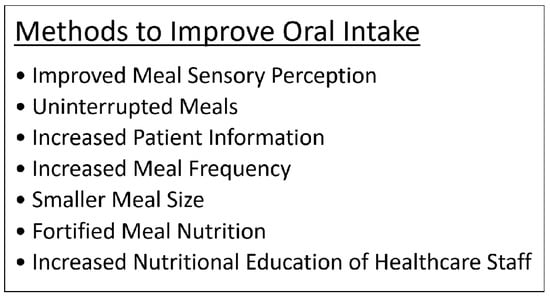 In general, adequate oral intake has been a difficult task for many patients facing malnutrition related to cirrhosis and other chronic ailments [52]. Patients with malnutrition are unable to maintain their daily caloric targets and requirements for nutrients despite institution of reinforced diet plans [52]. Many studies have reported that patients with malnutrition have significant amounts of calories wasted with each partially-ingested meal [53,54]. One study questioned patients after meals at the hospital in an attempt to understand the reasoning behind incomplete meal intake and suspected that meal sensory perception affected eating capability despite hunger [55]. Patients responded regarding various aspects of their meal experience (appearance, aroma, taste, texture, temperature, and food variety) and requested that more attention be paid to provide a more individualized eating experience [55]. These factors should be continuously re-evaluated to reflect the preferences of the patients as their appetite changes based on the severity of hepatic decompensation [55]. In addition to this study, others have shown that meal presentation and appearance impacts the desire to eat; patients ate more from a neatly-arranged plate rather than a disorganized one [54,55]. Additionally, overwhelming odors from food discouraged eating [55]. For example, when feeling nauseous, patients desired meals that had neutral tastes [55]. Often softer foods that were easier to ingest were associated with increased intake [55,56]. A hot meal versus a cold meal was more likely to be ingested [55]. Another study assessing issues with oral intake showed that interruptions during meal times by nurses, physicians, or tests led to missed meals that were never served later; patients were also unaware of the options available for extra snacks between meals [53]. This suggests that patients should have scheduled meal times that are protected and nursing staff should ensure that the patients eat during the dedicated meal period without interruption, plus improving patient awareness regarding additional accessible snacks can increase caloric intake [53]. Studies to improve intake noted that smaller meals, increased meal frequency, and fortified nutrition within these meals were effective in instituting increased nutritional support [57]. Furthermore, studies in the setting of cirrhosis found that 4–6 meals high in carbohydrates with an evening snack fortified with BCAAs prevented hypoglycemia and led to increased nutrition due to reduced catabolism overnight [8]. Another important factor found in studies was the level of nursing education [58]. Poulsen and colleagues [58] noticed increased nutrition and oral intake in patients when nurses were given a short class on nutritional care to provide individualized nutritional support. Figure 3 summarizes the various interventions that can be used to promote oral intake and improve nutritional status of patients with cirrhosis.