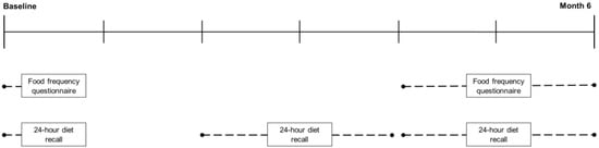 We collected three DRs over a six-month period (Figure 1) according to the same method described during FFQ development (Section 2.2.2). DRs were collected on randomly selected days, including weekdays and weekends, at health centers and the offices of Socios En Salud Sucursal Peru. Diet recalls were on the child’s diet but were completed with assistance from their caregiver who spent the most time with the child and was knowledgeable on daily intake.