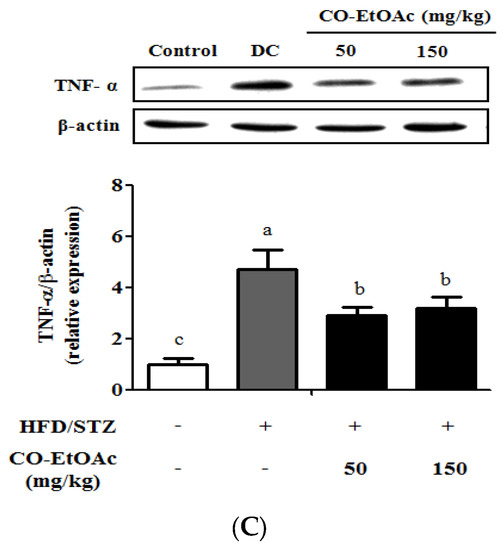 3.2. The Effect of CO-EtOAc on Body Weight, Food Intake and Biochemical Parameters
