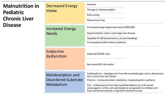Children with CLD can have an increase in energy requirements of up to 140% compared to children without CLD [26,27,28]. Children with end-stage liver disease in particular are in a hypermetabolic state, in which there is increased metabolic activity and excess lipid oxidation [29]. Moreover, this is further aggravated by the sequelae of CLD, including episodes of sepsis from peritonitis or cholangitis, as well as variceal bleeding [13,30]. Children with CLD can also have higher levels of pro-inflammatory cytokines, which have been correlated with malnutrition due to increased energy consumption [31].