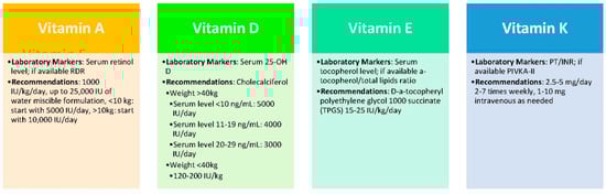 - Shneider, B.L.; Magee, J.C.; Bezerra, J.A.; Haber, B.; Karpen, S.J.; Raghunathan, T.; Rosenthal, P.; Schwarz, K.; Suchy, F.J.; Kerkar, N. Efficacy of fat-soluble vitamin supplementation in infants with biliary atresia. Pediatrics 2012, 130, e607–e614. [Google Scholar] [CrossRef] [PubMed]