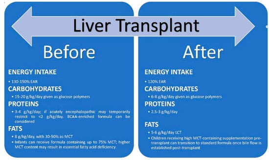 Malnutrition is a significant risk factor for both morbidity and mortality related to liver transplantation, thus nutritional support is of utmost importance in children with CLD prior to undergoing transplant (Figure 3) [15,95,96]. Children who were malnourished prior to transplant may require support with parenteral nutrition peri-operatively, while children with normal nutritional status prior to transplant can start enteral feedings with rapid buildup of calories within 3–5 days postoperatively. Children after liver transplant require at least 120% of EAR post-operatively, which can be administered in the form of high-energy pediatric and infant formulas, either orally or via nasogastric tube [30]. Children with oral aversion pre-operatively will likely require nasogastric supplementation post-operatively for up to two months; regular diet for age is usually achieved by six months [97]. Energy intake should include 6–8 g/kg/day of carbohydrates, 2.5–3 g/kg/day of protein, and 5–6 g/kg/day of fat [30].