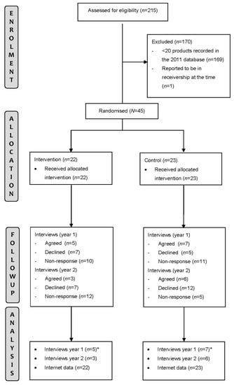 There were 215 potentially eligible companies identified for inclusion with 169 (79%) excluded because they had fewer than 20 products in the database and one (0.5%) because it was reported to be in receivership (Figure 1). Changes to ownership during follow-up occurred for three intervention companies and two control companies. All intervention and control companies were invited to participate in the year 1 and year 2 interviews—there were 12 (five intervention vs. seven control) in year 1, and 9 (three intervention vs. six control) in year 2. Year 1* interviews were previously analysed to inform the trial and are not reported in this present process evaluation report.