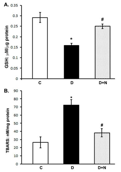 Effects of naringenin on glutathione (GSH) and thiobarbituric acid reactive substances (TBARS) levels in retina of diabetic and non-diabetic animals. (Panel A) and (panel B) represents measurements of GSH and TBARS respectively. Values are expressed as means ± SEM (standard error of mean); n = 6/group. D significantly different from control (C) (* p < 0.01); and D + N significantly different from D (# p < 0.05). C represents control, D as diabetic, and D + N as diabetic rats treated with naringenin.