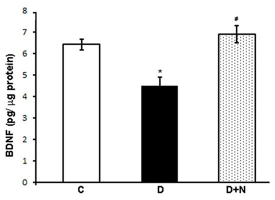 Brain derived neurotrophic factor (BDNF) concentration in the retina of control, naringenin-treated, and non-treated diabetic rats. Values are means ± SEM; n = 6/group. *,# p < 0.05 compared to control and diabetic rats, respectively. C represents control, D as diabetic, and D + N as naringenin-treated diabetic rats.