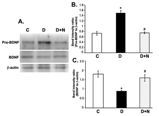 Western blot analysis of the expression of pro-BDNF and BDNF in retinas from control, diabetic, and naringenin-treated diabetic rats. The intensities of the bands were quantified by densitometry. (A) Representative immunoblots of pro-BDNF, BDNF and β-actin bands; (B,C) Data presented as ratios of those protein bands to β-actin. Values are means ± SEM; n = 6/group. * p < 0.05, significantly different from their controls; # p < 0.05, significantly different from diabetic. BDNF (brain derived neurotrophic factor), pro-BDNF (precursor of brain derived neurotrophic factor). C represents control, D as diabetic, and D + N as diabetic rats treated with naringenin.