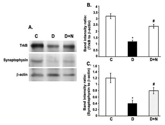 Western blot analysis of the expression of TrkB and synaptophysin in retinas from control, diabetic, and naringenin-treated diabetic rats. The intensities of the bands were quantified by densitometry. (A) Representative immunoblots of TrkB and synaptophysin and β-actin bands; Panel (B,C) Data presented as ratios of those protein bands to β-actin. Values are means ± SEM; n = 6/group. * p < 0.05, significantly different from their controls; # p < 0.05, significantly different from diabetic. TrkB; Tropomyosin receptor kinase. C represents control, D as diabetic, and D + N as diabetic rats treated with naringenin.