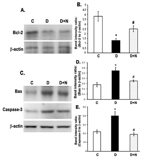 Western blot analysis of the expression of Bcl-2, Bax and caspase-3 in retinas from control, diabetic, and naringenin-treated diabetic rats. (A) Representative immunoblots of Bcl-2 and β-actin bands; (C) Representative immunoblots of Bax, caspase-3 and β-actin bands; (B,D,E) Data presented as ratios of those protein bands to β-actin. The intensities of the bands were quantified by densitometry. Values are means ± SEM; n = 6/group. * p < 0.01, significantly different from their controls; # p < 0.05, significantly different from diabetic. Bcl-2; B cell lymphoma 2. Bax; Bcl-2 associated X protein. C represents control, D as diabetic, and D + N as diabetic rats treated with naringenin.