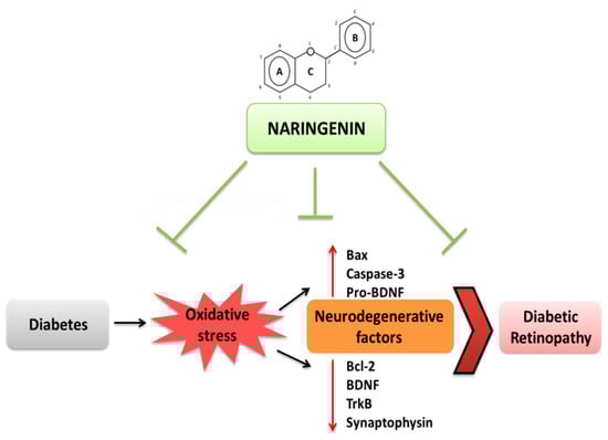 Schematic diagram summarizes diabetes-induced oxidative stress that leads to diabetic retinopathy. The findings of the current study showing that diabetes-induced oxidative stress activates apoptosis and decreases neurotrophic support leading to neuronal damage. Treatments with naringenin that target diabetes, oxidative stress and neurodegenerataive factors might be effective therapeutics in attenuating retinal neurodegeneration in diabetic retinopathy. Bcl-2; B cell lymphoma 2. Bax; Bcl-2 associated X protein. TrkB; Tropomyosin receptor kinase. BDNF; brain derived neurotrophic factor.