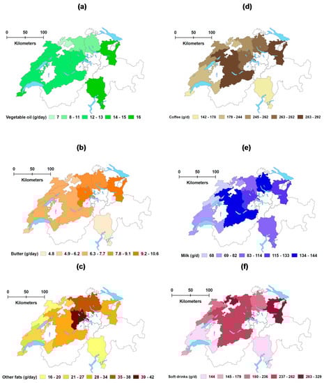 Daily consumption (weighted mean) of vegetable oil (a); butter (b); other fats (i.e., cream, fatty sauces and other fats) (c); coffee (d); milk (e); and soft drinks (f) for 12 cantons/states.