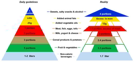 The daily national food-based dietary guidelines (i.e., Swiss Food Pyramid) (left) compared to the actual food consumption for the six stages at a population level (right).