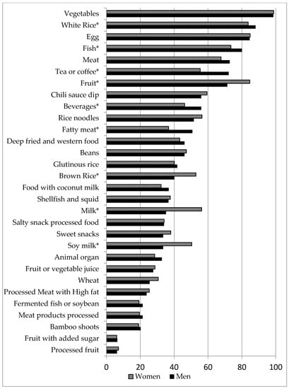 Percentage of Thai adults consuming each food group per week by sex. * χ2 p value < 0.05 when comparing weekly food group consumption frequency by sex.