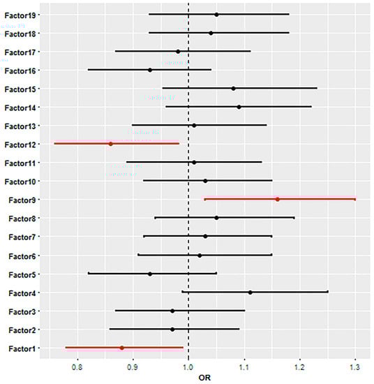Odds ratios (OR) and 95% confidence intervals obtained from the logistic regression analysis for the association of dietary groups (factors) with plasma TPO-Ab and/or Tg-Ab. Significant dietary groups are coloured in red, while not-significant dietary groups are coloured in black. If the OR and the lower limit of the 95% confidence interval are above 1, the dietary group is positively associated with plasma TPO-Ab and/or Tg-Ab, whereas if the OR and the upper limit of the 95% confidence interval are below 1, the dietary group is negatively associated with plasma TPO-Ab and/or Tg-Ab.