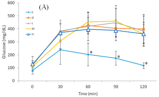 At Week 6, significantly higher blood glucose levels in Group D and treated groups (Groups L, M, and H) were observed compared to Group C at 0–120 min. Nevertheless, it was noted that blood glucose levels in Group H were significantly lower than those Group D at 60–120 min. The AUCs in Group D and treated groups (Groups L, M, and H) were significantly higher than that in Group C, but it was observed that the AUC in Group H was significantly lower than that in Group D.