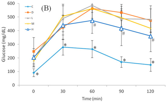 Oral glucose tolerance test (OGTT): (A) before; and (B) after the six-week melatonin intervention. All values are the mean ± SD (n = 8). * p < 0.05 compared to the diabetic group. # p < 0.05 compared to the diabetic group. C, control group; D, diabetic group; L, low-dosage group (10 mg melatonin/kg of body weight (BW)); M, medium-dosage group (20 mg melatonin/kg of BW); and H, high-dosage group (50 mg melatonin/kg of BW).