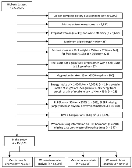 The Biobank dataset consisted of 502,655 people, however we excluded the following (see Figure 1): those without dietary or other relevant missing data, non-white ethnicity, pregnant women, those with a grip strength of zero, those with extremes of FFM, BMD, Mg, energy, protein, EI:EER, or BMI (bioelectrical impedance measures are considered unreliable at BMI extremes) [38]. These exclusions left a total of 156,575 people in the study (73,323 men and 82,098 women in the muscle analyses, 36,118 men and 40,441 women in the BMD analysis).