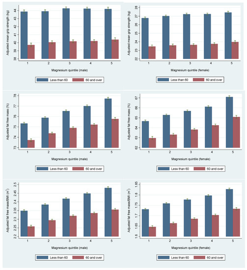 Greater grip strength was associated with higher intakes of Mg with significant inter-quintile differences of 1.1% in men and 2.4% in women, after adjustment for covariates, representing differences of 0.5 kg and 0.6 kg in men and women, respectively (p for trend < 0.001), Table 2. After stratification for age, these inter-quintile differences were greater in older than in younger men; 1.7% (p trend = 0.001, men ≥ 60 years of age) versus 0.8% (p trend = 0.021, men < 60 years), Table 3. However, in women, the associations were stronger in younger than in older women; 2.5% versus 2.2% (p trend < 0.001), Table 3.