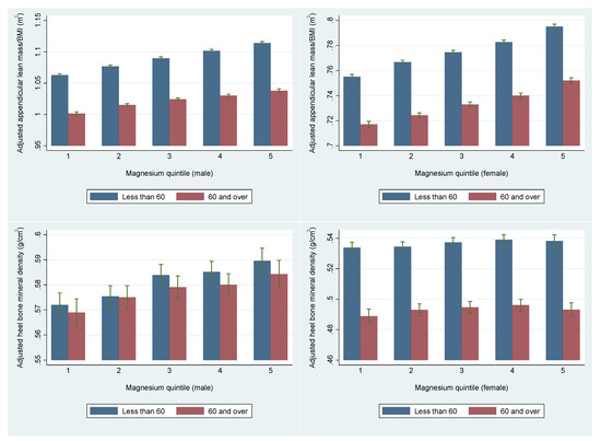 Associations between quintiles of magnesium intake and measurements of skeletal muscle mass and strength and bone density stratified by age above and below the age of 60 years.