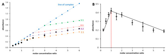 Figure 2. Assessment of the Fe2+-isoquercitrin complex stoichiometry at pH 6.8. Complementary approach (A): the final molar concentration of ferrous ions was 15 μM and the final molar concentration of isoquercitrin was 4–90 μM. The blue line corresponds to the absorbance of the formed complex at the excess of Fe2+ ions. Other lines show possible stoichiometries. Job’s plot (B): the total molar concentration of isoquercitrin and Fe2+ ions was 100 μM. In both cases, Fe2+ ions were allowed to react with isoquercitrin for 1 min before absorbance was measured at the maximum of the absorbance of the complex (λc, 404 nm). The molar concentration ratio signifies the ratio between the concentration of isoquercitrin to that of the ferrous ions. The assessment was performed with three independent stock solutions.
