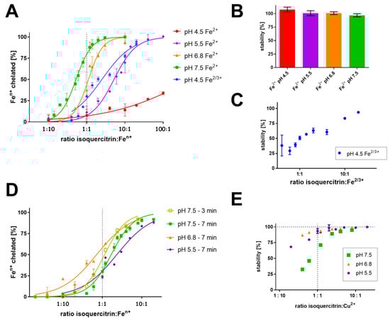 In order to assess in more details the capacity of isoquercitrin to interact with metals, competitive measurements were performed. In these assays, the indicator competes with isoquercitrin for the chelated metal. This testing can determine if the complexes measured by the non-competitive method are also formed under competitive conditions and whether they are stable with respect to time. Here, in line with non-competitive measurement, isoquercitrin clearly chelated both iron (Fe2+ and Fe3+) and cupric ions (Figure 3). However, isoquercitrin chelation potency toward iron dropped with decreasing pH (Figure 3A). These measurements can also provide information on the probable stoichiometry of the complexes if the chelator is able to maintain at a certain condition the metal in competition with the indicator. The easiest way is to look at the ratio 1:1. For example, at pH 6.8, the curve of chelation intersects the 1:1 ratio line (x axis) at about 50% chelation (y axis), this suggests that at 1:1 ratio about 50% of iron is chelated, thus, the complex will have probably the 2:1, isoquercitrin:iron, stoichiometry. At pH 7.5, around 70% of ferrous ions is chelated at the ratio 1:1 and this evokes the 3:2 stoichiometry (isoquercitrin:iron). At pH 5.5 and 4.5, the stoichiometry cannot be clarified since the affinity of isoquercitrin toward iron was obviously low since the curve intersects the 1:1 line at low chelation (y axis) values. Ferrous complexes were stable in contrast to the ferric ones at pH 4.5 (Figure 3B,C).