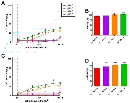 In general, the 3-hydroxy-4-keto moiety is strongly involved in chelation and this can be confirmed by direct comparison of chelation potency of isoquercitrin (glycosylated at C-3) and that of quercetin having this moiety available for chelation. To date there has been no study directly comparing chelation potency of these related flavonols, however, we can compare the data in this paper with our previous studies, which were performed using the same methodical approach [28,40]. Indeed, quercetin is a more potent chelator of copper and iron, with an exception of more acidic pH (4.5 and 5.5), where there is no significant difference in the potency between both compounds (Supplementary Figure S5). In addition, quercetin is an unambiguously stronger chelator of cuprous ions [28] than isoquercitrin (Figure 4).
