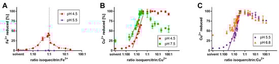 Figure 5. Metal reduction by isoquercitrin: (A) ferric ion reduction after 5 min. Data for pH 6.8 and 7.5 are not shown since there was no reduction similarly demonstrated for pH 5.5. (B,C) cupric reduction after 5 min. Isoquercitrin in respective buffers was mixed with Fe3+ or Cu2+ ions (the final concentration of both was 50 μM) and the indicator ferrozine or BCS was added, respectively. The absorbance was measured immediately and after 5 min. The percent reduction was calculated vs. positive control sample containing the Fe3+/Cu2+ ions with hydroxylamine as the reductant. There is a linear dependence between the reduction and ratio (or concentration) in the case of cupric reduction if we neglect both poles (maximal reduction and insignificant reduction vs. solvent).