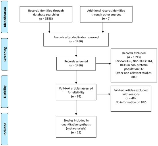Flow diagram of literature search process. RCTs: randomized controlled trials; BPD: bronchopulmonary dysplasia.