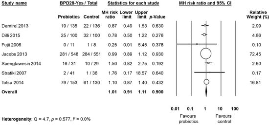 Random effects meta-analysis: Probiotic supplementation and risk of BPD28 (bronchopulmonary dysplasia, defined as oxygen dependence at 28 days of life). MH: Mantel–Haenszel; CI: confidence interval.
