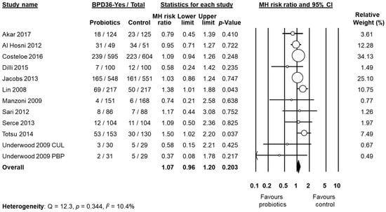 Random effects meta-analysis: Probiotic supplementation and risk of BPD36 (bronchopulmonary dysplasia, defined as oxygen dependence at 36 weeks post-menstrual age). MH: Mantel–Haenszel; CI: confidence interval. CUL: Culturelle preparation; PBP: ProBioPlus DDS preparation.