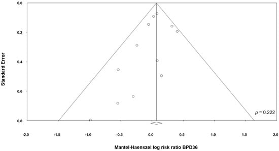 Funnel plot assessing publication bias for BPD36 (bronchopulmonary dysplasia, defined as oxygen dependence at 36 weeks post-menstrual age).