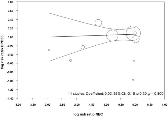 All the included studies reported data on NEC (Table 3) and, when pooled, we observed that probiotics significantly reduced the risk of developing NEC (RR 0.52, 95% CI 0.33–0.81, p = 0.004, Table 4). This significant reduction of NEC was also observed when we pooled the studies that reported BPD28 (RR 0.40, 95% CI 0.18–0.88, p = 0.022), and when we pooled the studies that reported BPD36 (RR 0.48, 95% CI 0.29–0.81, p = 0.006, Table 4). We performed meta-regression analyses (methods of moments) to investigate the possible correlation between the effect size for NEC and the effect size for BPD. As shown in Figure 5, meta-regression could not detect a statistically significant correlation between the reduction in NEC produced by the probiotics and the effect size for BPD36.