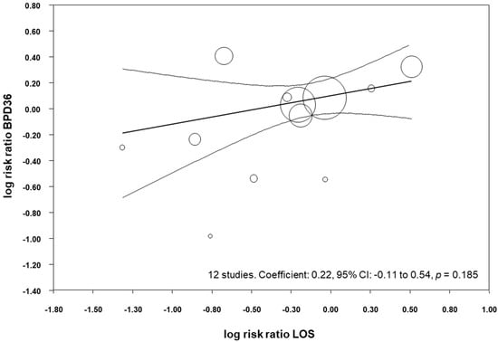 All the included studies reported data on LOS (Table 3), and meta-analysis demonstrated a close to significant reduction of LOS in the probiotics group (RR 0.82, 95% CI 0.65–1.03, p = 0.084, Table 4). Similarly, the meta-analysis of studies that reported BPD28 found a close to significant effect of probiotics on LOS (RR 0.79, 95% CI 0.63–1.00, p = 0.054), and the meta-analysis of studies that reported BPD36 found a close to significant reduction in LOS (RR 0.80, 95% CI 0.62–1.04, p = 0.090, Table 4). We performed meta-regression analyses (methods of moments) to investigate the possible correlation between the effect size for LOS and the effect size for BPD36. As shown in Figure 6, meta-regression could not detect a statistically significant correlation between the reduction in LOS produced by the probiotics and the effect size for BPD36.