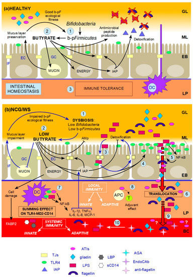 indicates inhibition. (a) HEALTHY: 1. Butyrate-producing Firmicutes (b-pF) provide adequate levels of butyrate in the ML and Bifidobacteria support the production of butyrate thanks to cross-feeding interactions with b-pF; 2. Butyrate in the ML, close to ECs, plays different trophic and protective functions: it stimulates GCs in the production of mucins, resulting in the preservation of the ML, and thus in a good b-pF ecological fitness. Butyrate constitutes the major energy supply for ECs; it favours the preservation of tight junctions (TJs) integrity by stimulating the expression and membrane co-localization of tight junction proteins (TJPs). Butyrate stimulates the production of antimicrobial peptides (AMp), and the expression and activity of intestinal alkaline phosphatase (IAP), thereby favouring the detoxification of microbial components; 3. All these functions together prevent that the content of the GL directly contacts and/or translocates across the EB, and, together with dendritic cells (DCs) which probe the GL for the presence of antigens, allow gut homeostasis and immune tolerance. (b) NCG/WS: (1) A dysbiosis characterized by low levels of b-pF and/or Bifidobacteria results in not sufficient levels of butyrate in the ML; (2) As a consequence, a chain reaction of events and vicious circles occur: the production of mucins is no longer stimulated, resulting in impairment of the ML. The consequent lowering of b-pF ecological fitness further promotes low levels of butyrate. ECs, without adequate energy source, run into inefficiency and cell damage, resulting in high serum levels of fatty acids binding protein 2 (FABP2). Moreover, TJs integrity is compromised, and the production of AMp is decreased. Low levels of butyrate also cause a decrease in the expression levels and activity of IAP; as a consequence, TJs integrity is further impaired, and the detoxification of microbial components is not sufficient; (3) The failed detoxification enables microbial lipopolysaccharide (LPS) to penetrate in the IF, where it increases paracellular permeability, with a consequent vicious cycle; (4) Furthermore, both LPS in the IF and low levels of butyrate upregulate toll-like receptors 4 (TLR4); (5) Because of the compromised ML, the lumenal content can reach EC surface. LPS and wheat amylase trypsin inhibitors (ATIs) can stimulate overexpressed TLR4, resulting in the production of NF-kB, and then later, inflammatory cytokines, which further damage TJs integrity; (6) Food-borne antigens and microbial components can cross the leaky EB; (7) In the LP, both translocated LPS and ATIs stimulate, at the same time, the TLR4-MD2-CD14 complex on myeloid cells, such as DCs, resulting in a local innate immune response with the production of inflammatory cyokines and chemokines. Among the latter, IL-1β and TNFα further inhibit the activity of IAP, thus maintaining this condition; (8) Moreover, ATIs have an adjuvant effect on possible pre-existing antigenic exposition of antigen-presenting cells (APC) to T-cells (T), triggering an adaptive immune response; (9) Microbial and food-borne antigens translocate in the BC (10), and trigger a systemic innate and adaptive immune response, respectively resulting in high serum levels of lipopolysaccharide-binding protein (LBP) and soluble CD14 (sCD14), and EndoCAb, anti-flagellin and anti-gliadin (AGA) antibodies.