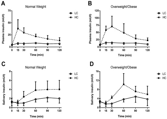 Two-hour plasma and saliva insulin responses to low-carbohydrate (LC) and high-carbohydrate (HC) breakfast meals in normal weight (NW) and overweight/obese (OO) participants. (A) Plasma insulin levels in NW participants; (B) Plasma insulin levels in OO participants; (C) Saliva insulin levels in NW participants; and (D) saliva insulin in OO participants. Statistical analyses were performed on the areas under the curve shown in Figure 2.