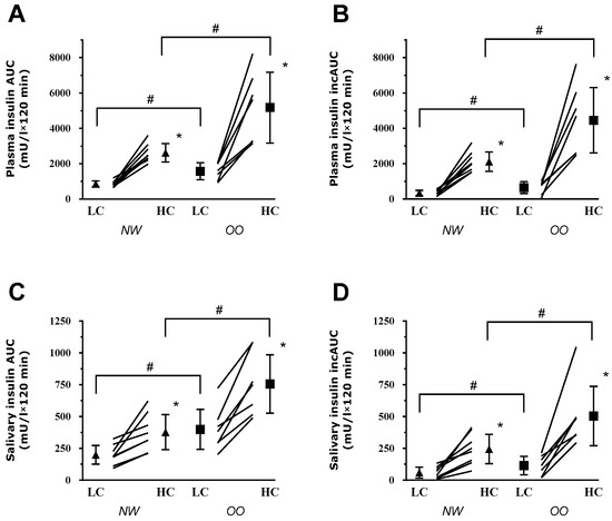 Plasma and saliva insulin area under the curve (AUC) in normal weight (NW) and overweight/obese (OO) following low-carbohydrate (LC) and high-carbohydrate (HC) breakfast meals. (A) Plasma AUC in NW and OO participants; (B) Plasma incremental AUC (iAUC) in NW and OO participants; (C) Saliva AUC in NW and OO participants; and (D) Saliva iAUC in NW and OO participants. * p ≤ 0.005 vs. LC meal within group. # p < 0.05 vs. NW group within meal.