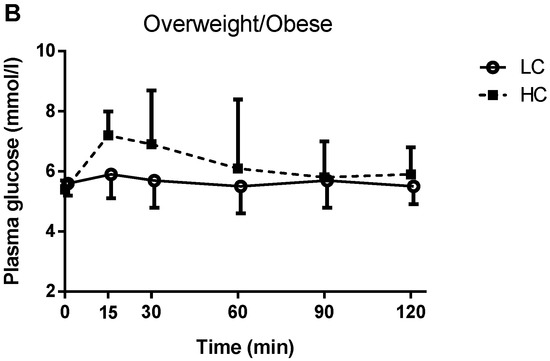 Two-hour plasma glucose responses to low-carbohydrate (LC) and high-carbohydrate (HC) breakfast meals in normal weight (NW) and overweight/obese (OO) participants. (A) Plasma glucose in NW participants; (B) Plasma glucose in OO participants.