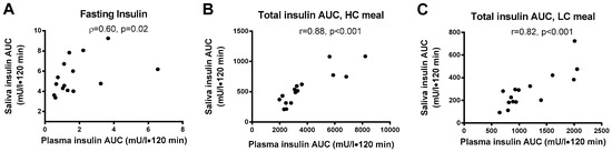 Relationships between plasma and saliva insulin concentrations. (A) Fasting plasma and saliva insulin; (B) Two-hour plasma and saliva insulin total area under the curve (AUC) following the high-carbohydrate (HC) meal; (C) Two-hour plasma and saliva AUC following the low-carbohyrate (LC) meal.