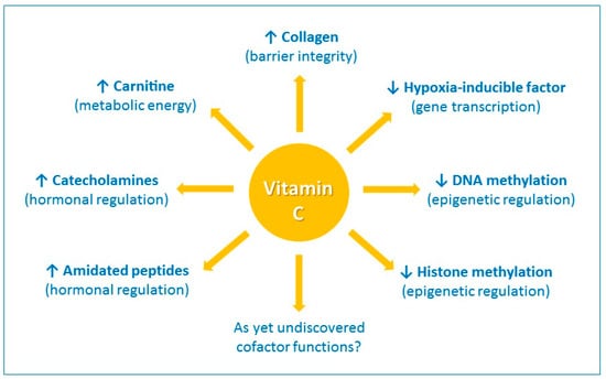 Vitamin C is also a cofactor for the hydroxylase enzymes involved in the synthesis of catecholamine hormones, e.g., norepinephrine, and amidated peptide hormones e.g., vasopressin, which are central to the cardiovascular response to severe infection [20]. Furthermore, research over the past 15 years or so has uncovered new roles for vitamin C in the regulation of gene transcription and cell signaling pathways through regulation of transcription factor activity and epigenetic marks (Figure 1) [21,22]. For example, the asparagyl and prolyl hydroylases required for the downregulation of the pleiotropic transcription factor hypoxia-inducible factor-1α (HIF-1α) utilize vitamin C as a cofactor [21]. Recent research has also indicated an important role for vitamin C in regulation of DNA and histone methylation by acting as a cofactor for enzymes which hydoxylate these epigenetic marks [22].