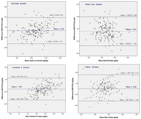 Except for daily fiber intake, the FFQ1 estimated a higher nutrient intake than the dietary record method. The highest difference was observed in calcium, fat, and vitamin D intake. The median difference also ranged from 0.5 mg/day for nitrate intake to 245.1 mg/day for calcium. Except for fiber (MD = 0.1, 95% CI = −2.7, 2.9) and alcohol intake (MD = −1.7, 95% CI = −4.8, 1.4), a significant difference was observed between FFQ1 and the 3-day diary in other nutrients.