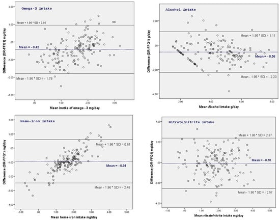 A high correlation between both methods was only observed for total alcohol intake (ρ = 0.71). For fat, omega-3, and nitrate/nitrite intake, however, the correlation of quantities estimated was very low. Low classification agreement was also observed for all nutrients except for alcohol intake (Table 5). Since differences in nutrient intakes were associated with the mean measurement, data related to the nutrient intake were log transformed for Bland and Altman statistics. The result showed that a systematic mean difference between FFQ1 and 3-day diary was observed for all the nutrients except for alcohol and fiber intake. However, the 95% limits of agreement were rather small (Figure 1).