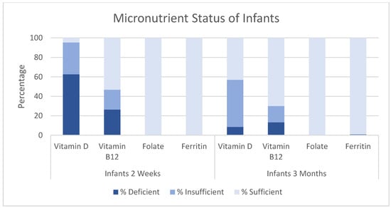 Descriptive statistics for infants’ and mothers’ micronutrient statuses are displayed in Table 3. On average, infants at three months had higher vitamin D levels (nmol/L), vitamin B12 (pg/mL), folate (ng/mL) levels, and lower ferritin (ng/mL) levels than infants two weeks old. For infants two weeks old, 62.6% were categorized as deficient in vitamin D and 26.4% were deficient in vitamin B12. No infants at two weeks of age had deficiencies in folate or iron. For infants at three months, 8.6% were categorized as deficient in vitamin D and 48.4% were categorized as insufficient deficient in vitamin D. 13.3% of infants at three months were categorized as vitamin B12 deficient and 16.7% were categorized as insufficient in vitamin B12. Less than 1% of infants at three months were categorized as deficient in folate or iron (Figure 1).