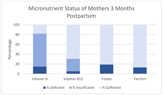 For mothers at three months postpartum, 14.8% were deficient in vitamin D and 67.2% were categorized as insufficient; 5.2% of mothers were vitamin B12 deficient, while 25.6% of mothers were categorized as insufficient for vitamin B12; 19.0% of mothers were deficient in folate and 26.0% of mothers were deficient in ferritin (Figure 2).