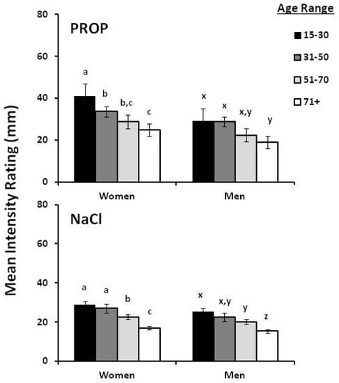 Mean (±Standard Error, SE) 6-n-propylthiouracil (PROP) (top) and NaCl (bottom) ratings across age groups in both women and men from the isolated community of Val Borbera, Northwest Italy. n = 589; sample size per age group: 59 (15–30 years); 191 (31–50 years); 261 (51–70 years); 78 (71+ years). Ratings by men and women were analyzed separately. For women, mean values within a stimulus type (PROP or NaCl), with different superscripts (a, b and c) are significantly different as a function of age; superscripts x, y and z are used to denote age differences for men. Significant differences, within a stimulus type (PROP or NaCl), are indicated by different letters (a, b and c are used to denote differences for women, while x, y and z for men). For all comparisons, p < 0.001 by Duncan’s Multiple Range test subsequent to ANOVA. Unpublished data from Tepper et al. [].