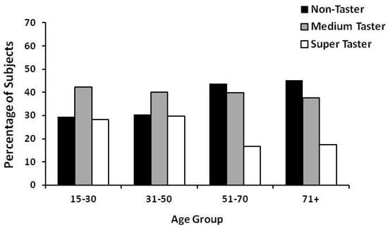 Distribution of PROP taster groups by age in the isolated community of Val Borbera, Northwest Italy. n = 589; sample size per age group: 59 (15–30 years); 191 (31–50 years); 261 (51–70 years); 78 (71+ years). The percentage of non-tasters increased and the percentage of super-tasters decreased in those >50 years of age (by Chi-square analysis; p < 0.001). Unpublished data from Tepper et al. [].